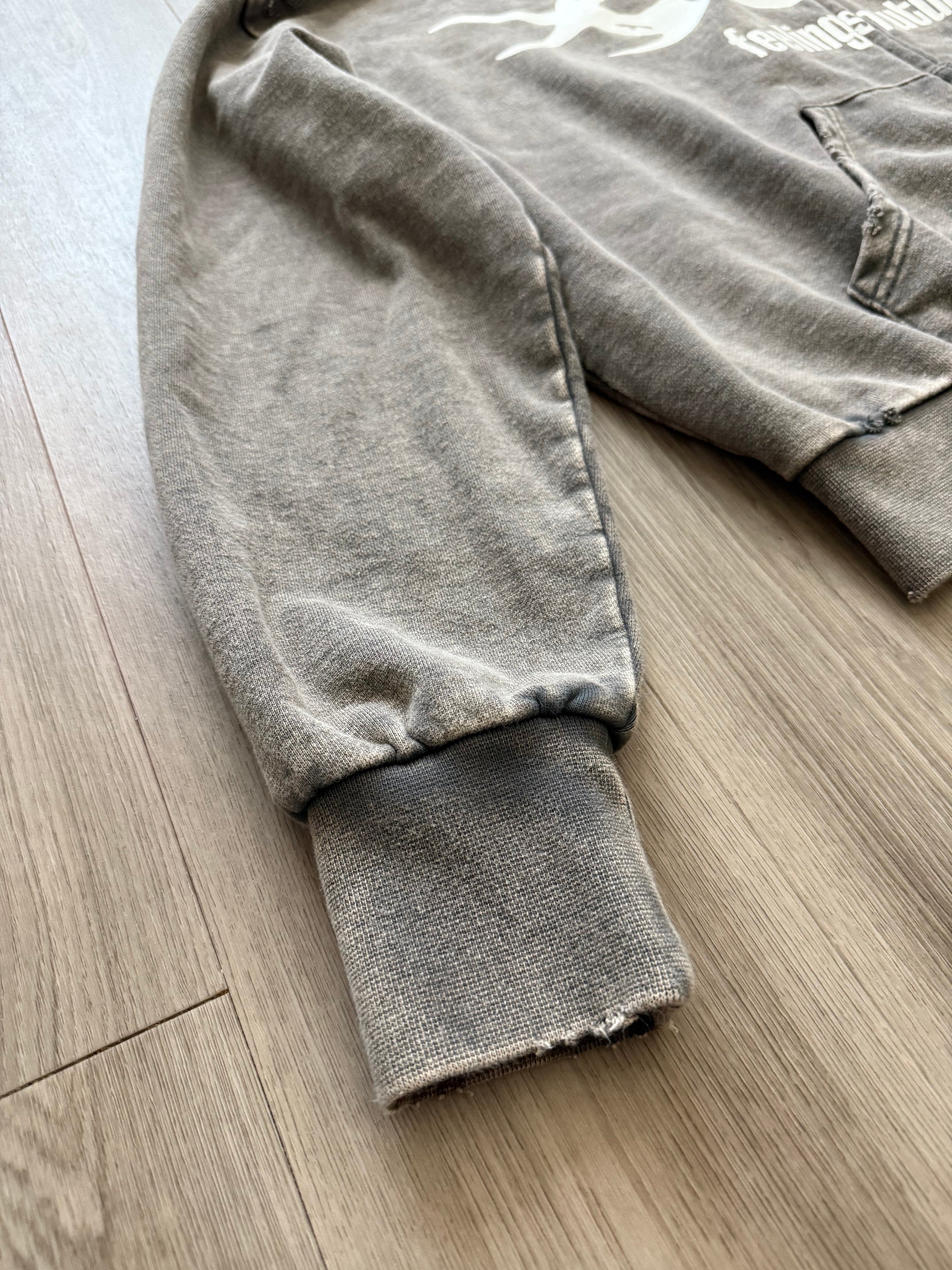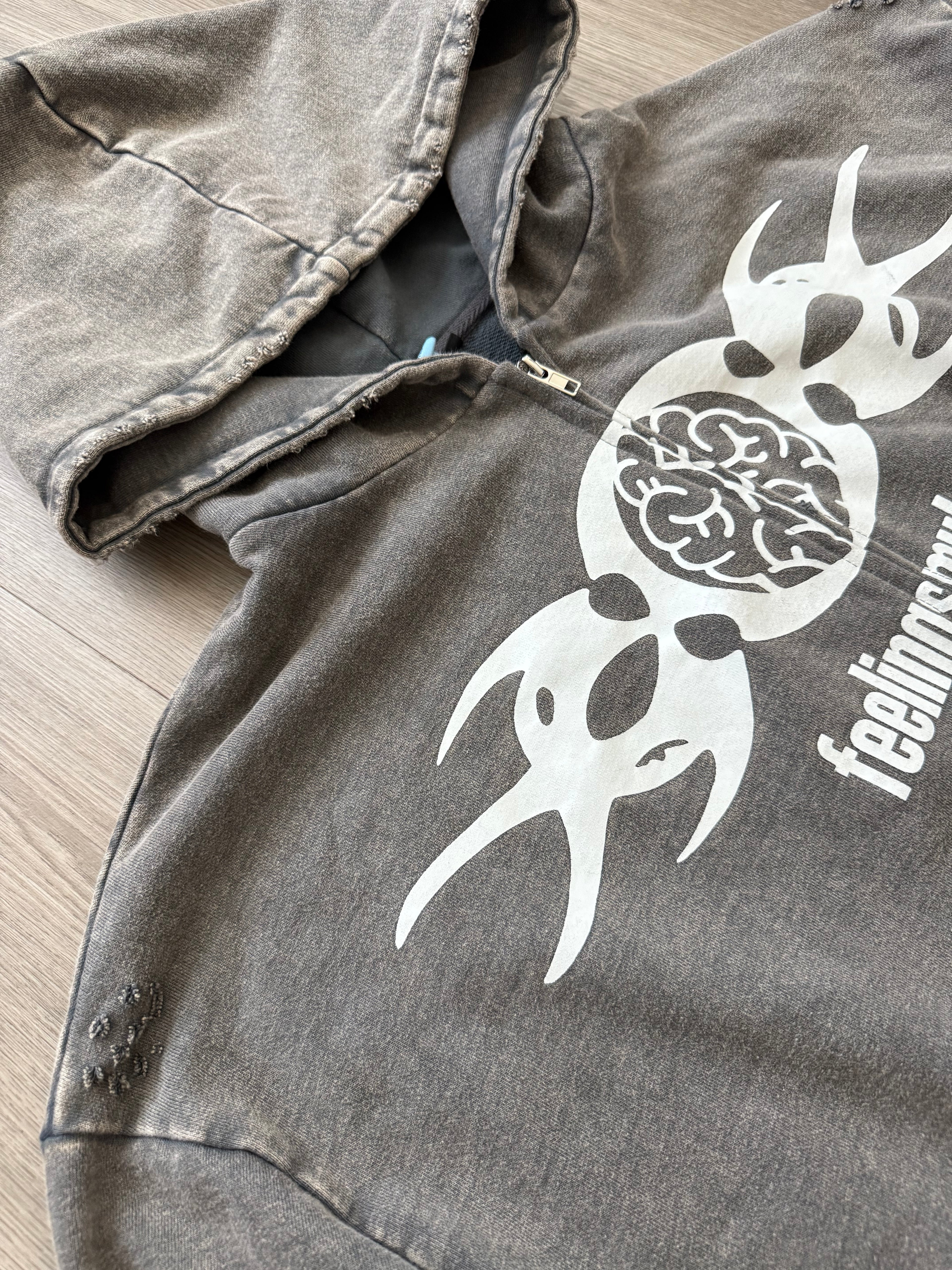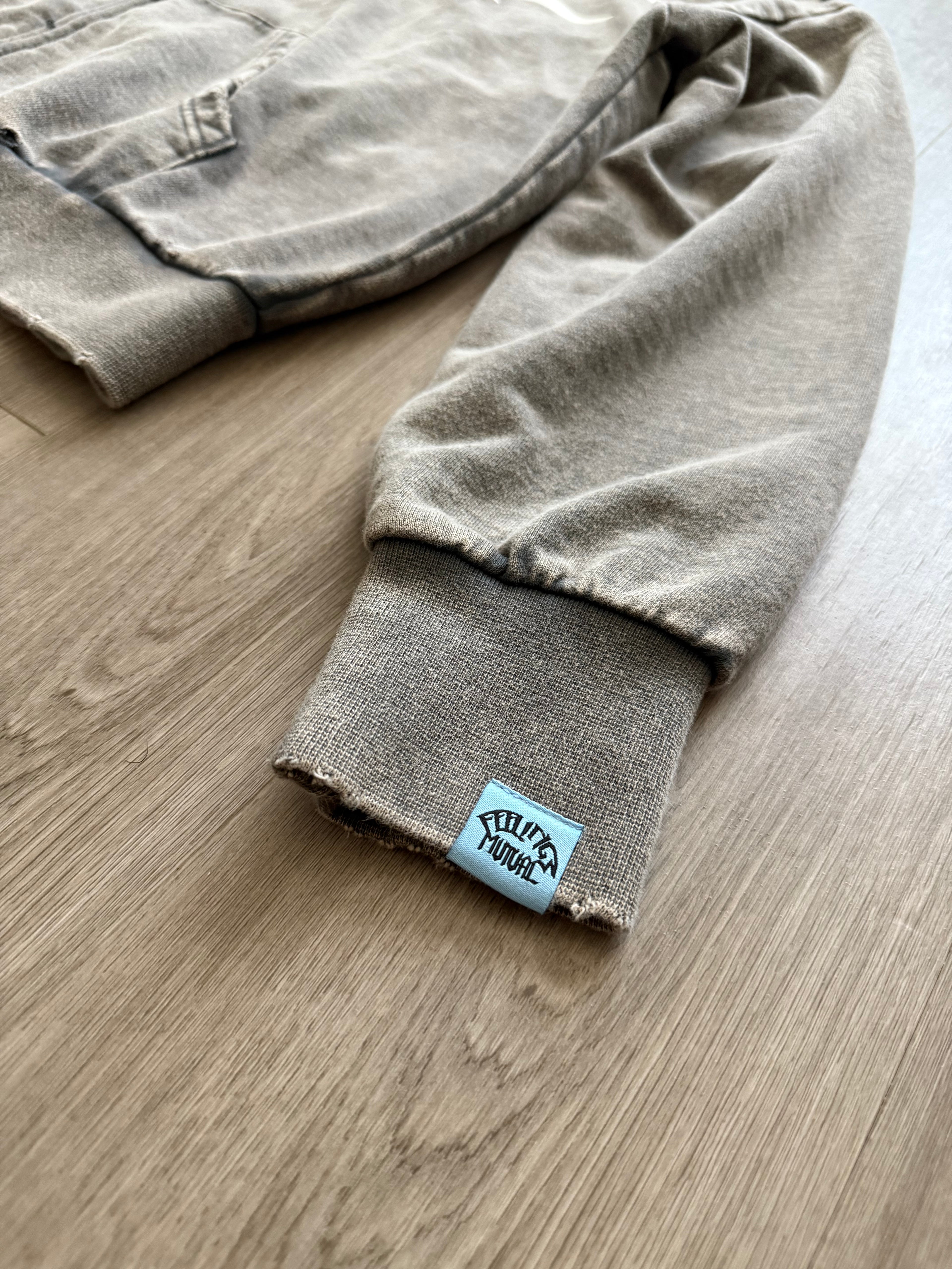 Details: 440 GSM, washed gray with distressed stitching, pockets in front