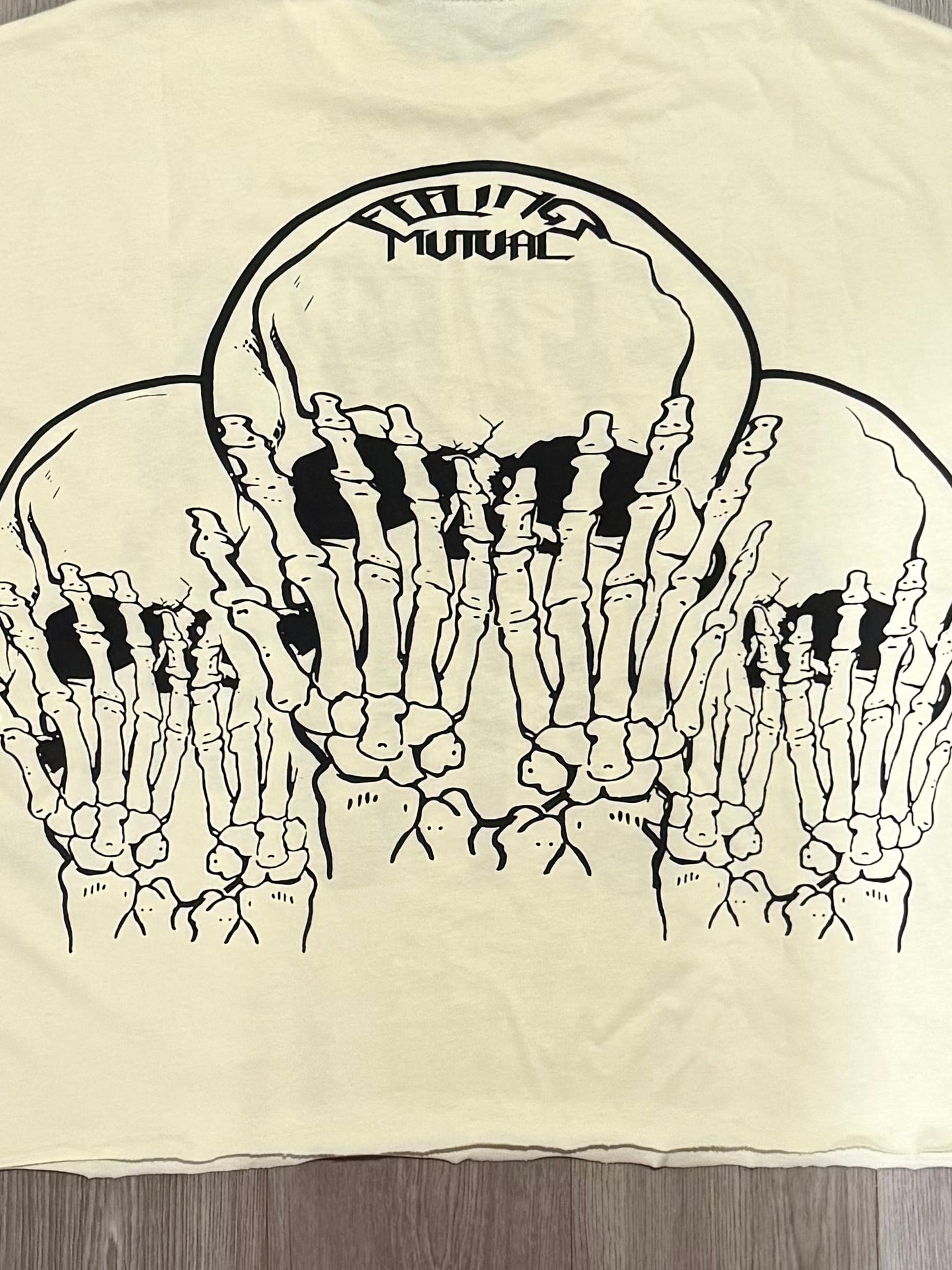 Details: Cream color, cut sleeves, drop armholes, cut hem, and riveted rhinestones on the front